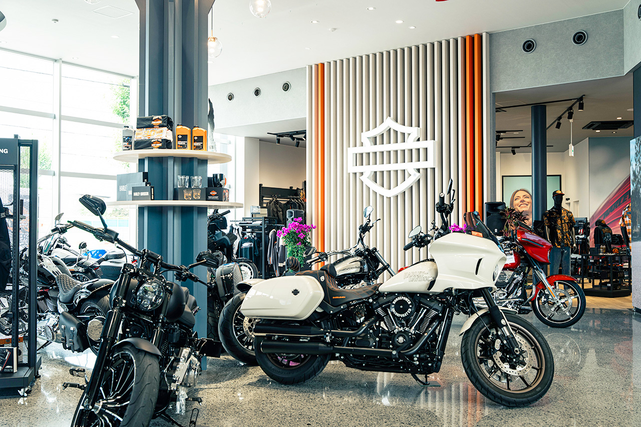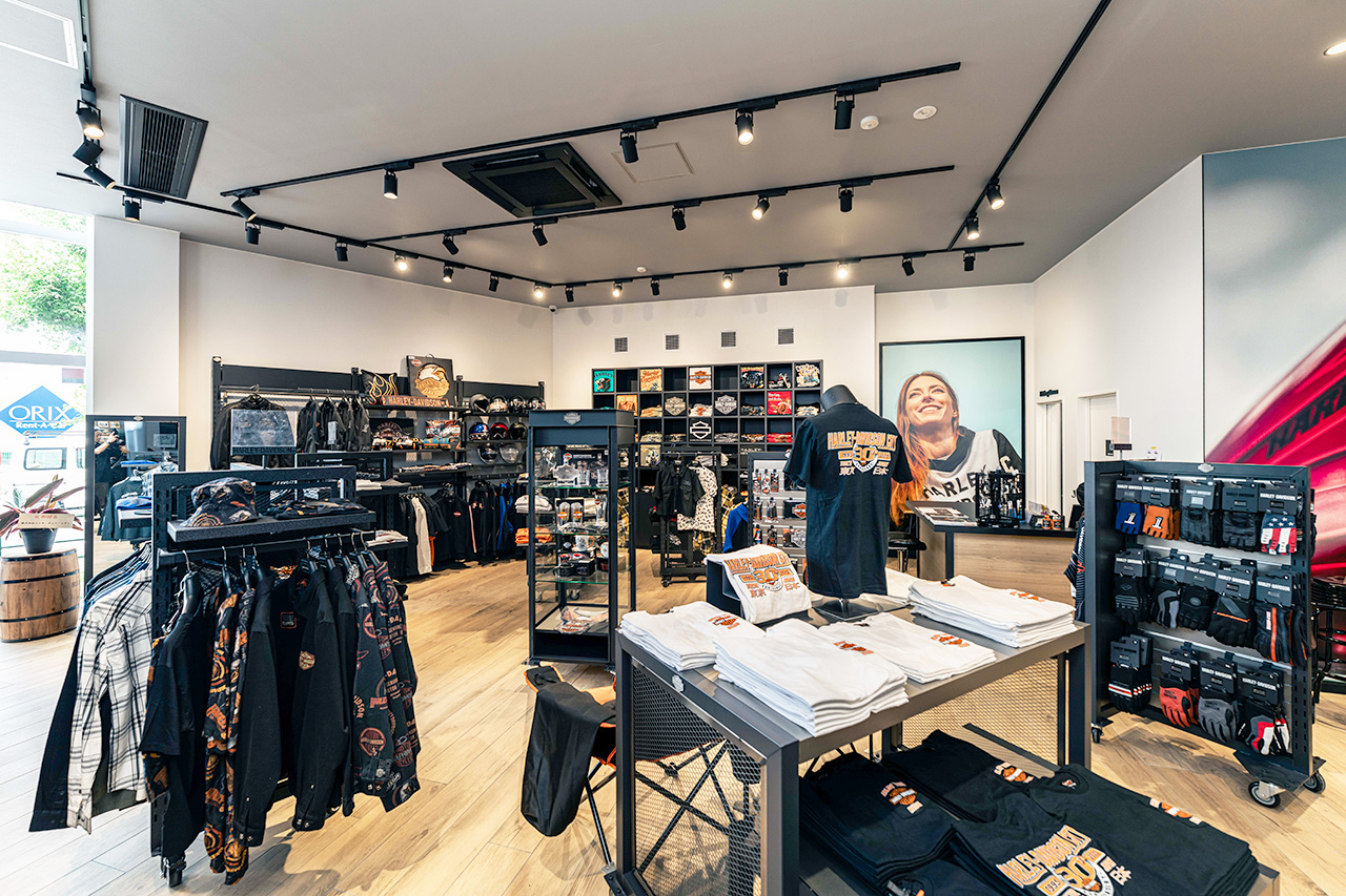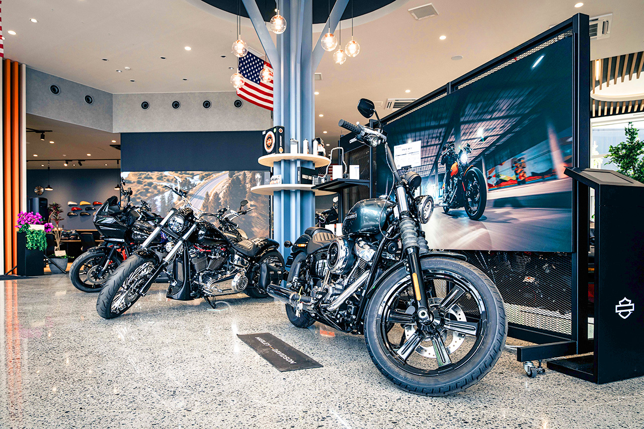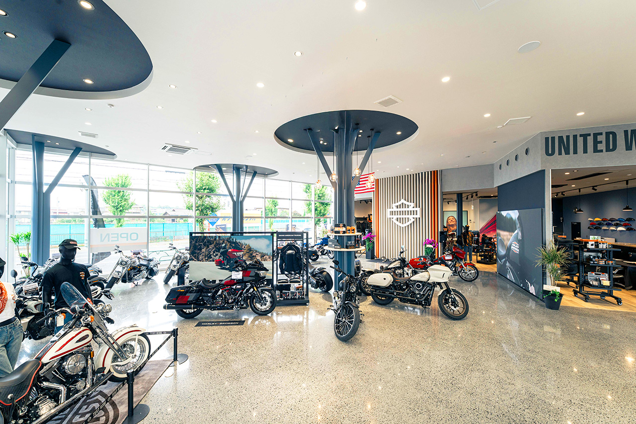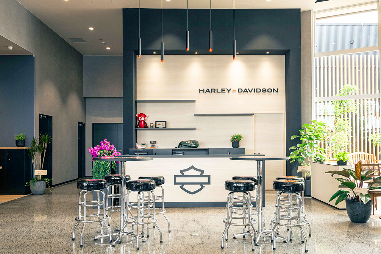ハーレーダビッドソンのイメージにリンクする形状と色で造作。